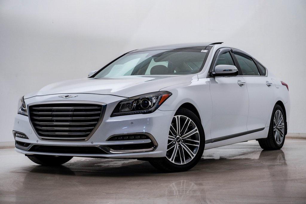 Priced below KBB Fair Purchase Price! Casablanca White 2018 Genesis G80 4D Sedan 3.8 3.8L V6 DGI DOHC Dual CVVT RWD Odometer is 22112 miles below market average! Clean CARFAX.Option Group 02, Premium Package 02.Get ready to experience the Napleton Aston Martin and Maserati difference. Our friendly, inviting staff are here to bring you the luxury experience no matter what type of vehicle you’re looking for. We respect your time, and do everything we can to make the car buying experience as simple, transparent and worry free as possible. All of our pre-owned vehicles are thoroughly inspected and come with a Carfax vehicle history report, and market pricing report to ensure full transparency. Call to schedule your VIP appointment today.This G80 is well equipped with Option Group 02, Premium Package 02 (7"" Color LCD Multi-Information Display, Front & Rear Parking Sensors, Front Wireless Charging Pad, LED Foglights, Power Rear Window Sunshade, and Power Tilt-and-Slide Panoramic Sunroof), 12-Way Power Heated & Vented Front Bucket Seats, 12-Way Power Heated Front Bucket Seats, 18"" Alloy Wheels, 4-Wheel Disc Brakes, 7 Speakers, ABS brakes, Air Conditioning, Alloy wheels, AM/FM radio: SiriusXM, Android Auto & Apple CarPlay, Anti-whiplash front head restraints, Auto High-beam Headlights, Auto tilt-away steering wheel, Auto-dimming door mirrors, Auto-dimming Rear-View mirror, Automatic temperature control, Bodyside moldings, Brake assist, Bumpers: body-color, Carpeted Floor Mats, CD player, Compass, Delay-off headlights, Driver door bin, Driver vanity mirror, Dual front impact airbags, Dual front side impact airbags, Electronic Stability Control, Emergency communication system: Genesis Connected Services, Exterior Parking Camera Rear, First Aid Kit, Four wheel independent suspension, Front anti-roll bar, Front Bucket Seats, Front Center Armrest, Front dual zone A/C, Front reading lights, Fully automatic headlights, Garage door transmitter: HomeLink, Heated door mirrors, Heated front seats, High intensity discharge headlights: Bi-Xenon, Illuminated entry, Knee airbag, Leather Seating Surfaces, Leather Shift Knob, Leather steering wheel, Low tire pressure warning, Memory seat, Mud Guards, Navigation System, Occupant sensing airbag, Outside temperature display, Overhead airbag, Overhead console, Panic alarm, Passenger door bin, Passenger vanity mirror, Power door mirrors, Power driver seat, Power passenger seat, Power steering, Power windows, Radio data system, Radio: AM/FM/HD/SiriusXM/CD/MP3 Audio System, Radio: AM/FM/XM/HD/CD/MP3 Audio System, Rain sensing wipers, Rear anti-roll bar, Rear reading lights, Rear seat center armrest, Rear side impact airbag, Rear window defroster, Rearview Camera w/Parking Guidelines, Remote keyless entry, Reversible Cargo Tray, Security system, Speed control, Speed-sensing steering, Speed-Sensitive Wipers, Steering wheel memory, Steering wheel mounted audio controls, Tachometer, Telescoping steering wheel, Tilt steering wheel, Traction control, Trip computer, Turn signal indicator mirrors, and Variably intermittent wipers.